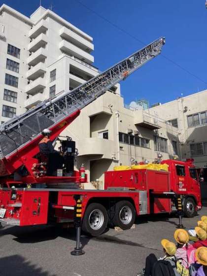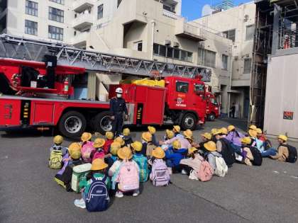子どもたちは、消防士さんになぜ消防士さんになったのか質問したり、サイレンの音を近くで聞いてサイレンの音の違いを聞いたり、気になることを聞いて学習しました。