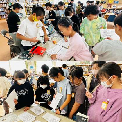 ビンゴカードには、「生き物の本」「歴史の本」「○分類の本」「200ページより多い本」「食べ物が出てくる本」など、色々な種類の本が書かれています。