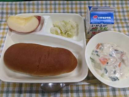 11月8日(水)のこんだては「きのこのクリームシチュー、キャベツのピクルス、りんご、黒糖パン、牛乳」です。