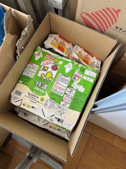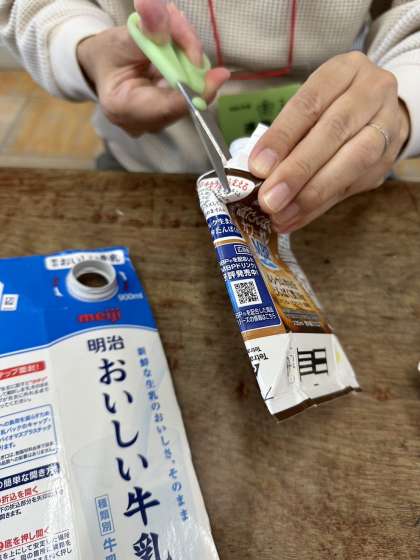 ベルマーク委員会ではご家庭からお持ちいただいた、テトラパックがついた牛乳パックやジュースのパックなどを発送する作業を行っています。