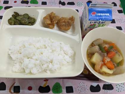 11月10日(金)のこんだては「あげどりのねぎだれかけ、豚肉とじゃがいもの煮もの、きゅうりの赤じそあえ、ごはん、牛乳」です。