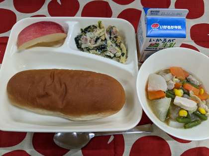 11月15日(水)のこんだては「ほうれんそうのグラタン、スープ煮、りんご、黒糖パン、牛乳」です。