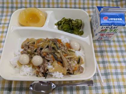 11月16日(木)のこんだては「中華丼【個別対応献立:うずら卵】、きゅうりのピリ辛あえ、白桃(缶)、牛乳」です。