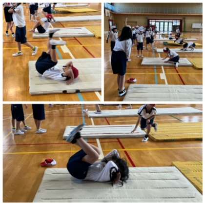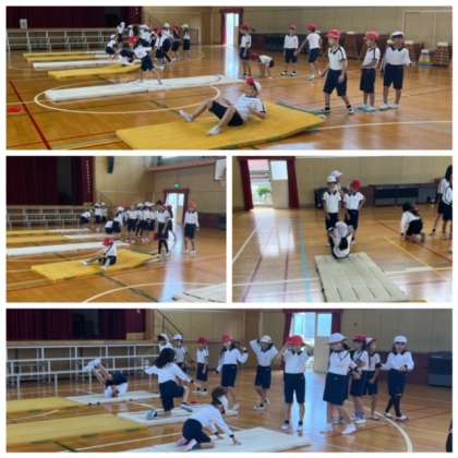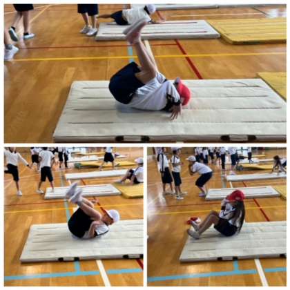 マット運動に取り組んでいます。斜面を使った開脚前転もしています。
