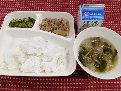 11月29日(水)のこんだては「豚肉のコチジャンいため、鶏肉とはるさめのスープ、きゅうりのナムル、ごはん、牛乳」です。