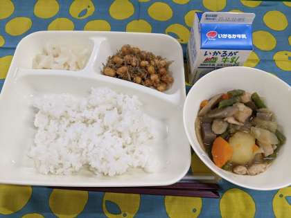 12月6日(水)のこんだては「鶏肉と野菜の煮もの、じゃこ豆、かぶのゆず風味、ごはん、牛乳」です。
