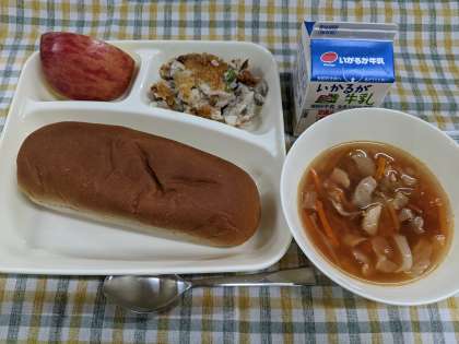 12月7日(木)のこんだては「きのこのドリア、トマトスープ、りんご、黒糖パン、牛乳」です。