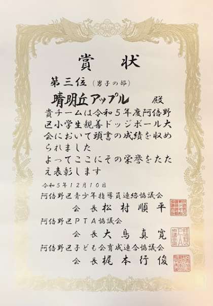 男子の部で晴明丘アップルチームが、堂々の3位を獲得しました。銅メダルを首にかけて整列です。おめでとうございます!