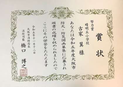 続いて、令和5年度大阪市防火・防災図画募集で努力賞の栄誉をたたえ表彰状が授与されました。おめでとうございます!