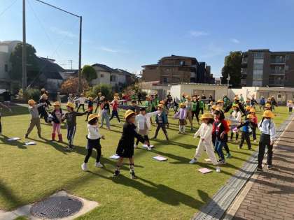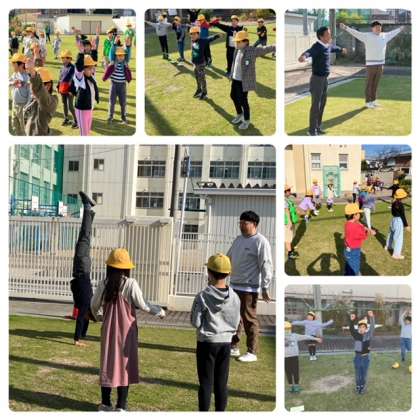 芝生にたくさんの児童が集まり、元気に身体を動かします。身体がぽかぽかしていい気持ちでした。