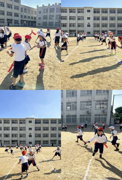 1年生は体育で、宝運び鬼をしています。ズボンにタグをつけて鬼役のネコにタグを取られないようにネズミ(逃げ)は宝(白玉)をゴールまで運びます。