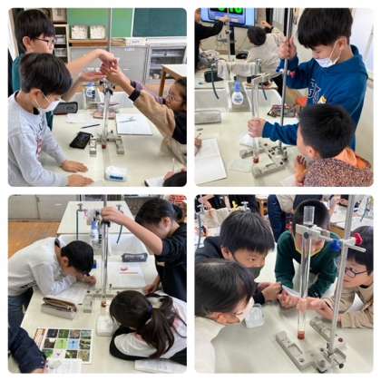 理科「もののとけ方」で、食塩が水にとける様子を観察しました。50cmのパイプの中の水に、食塩をひとつまみ入れてそのとける様子をじっくり見ています。