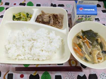 1月18日(木)のこんだては「豚肉のごまだれ焼き、みそ汁、きくなとはくさいのおひたし、ごはん、牛乳」です。