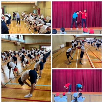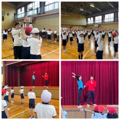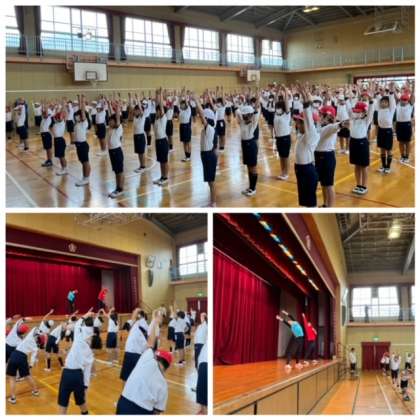 どの部位の運動なのか、呼吸の大切さ、かけ声、視線・・・アドバイスが的確で、子どもたちの動きがどんどん良くなるのがわかります。仕上げは音楽に合わせてのラジオ体操第一、とても美しい体操になりました。