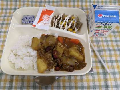 1月23日(火)のこんだては「牛肉と金時豆のカレーライス、ごぼうサラダ、固形チーズ、牛乳」です。