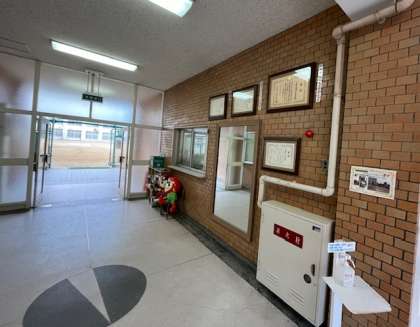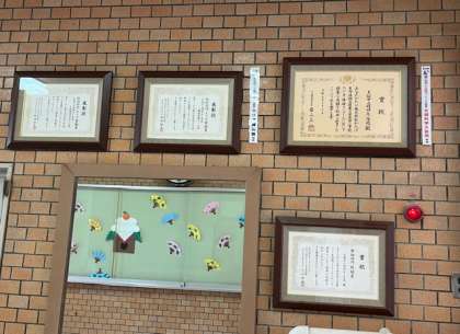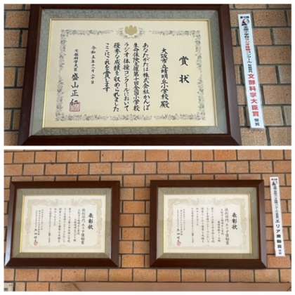昨年度の「敢闘賞」が掲示してある上部に、「文部科学大臣賞」「エリア奨励賞」の額縁を展示しています。