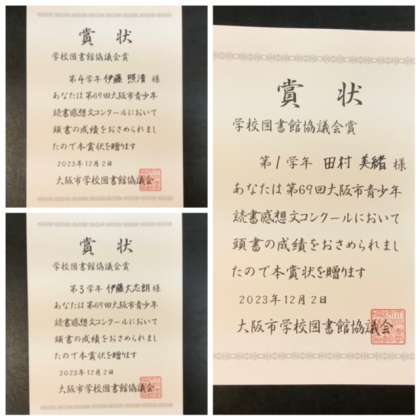 大阪市学校図書館協議会より、第69回大阪市青少年読書感想文コンクールで学校図書館協議会賞が授与されました。みんなから大きな拍手が贈られました。