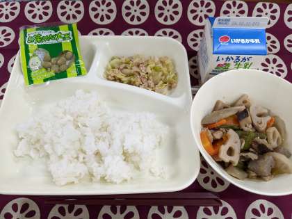 1月29日(月)のこんだては「筑前煮、ツナとキャベツのごまいため、まっ茶大豆、ごはん、牛乳」です。