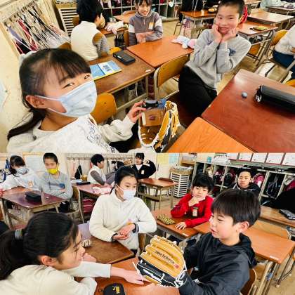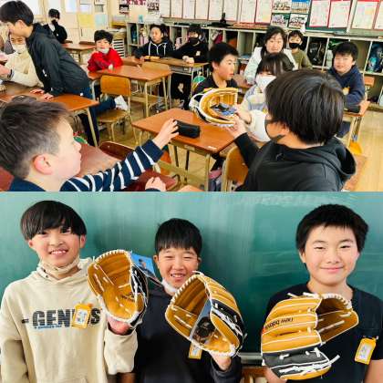 5年生の教室に、大谷選手の野球グローブがまわってきました。