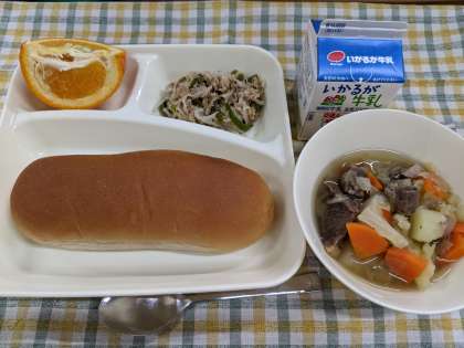 2月2日(金)のこんだては「ポトフ、ツナと野菜のソテー、いよかん、黒糖パン、牛乳」です。