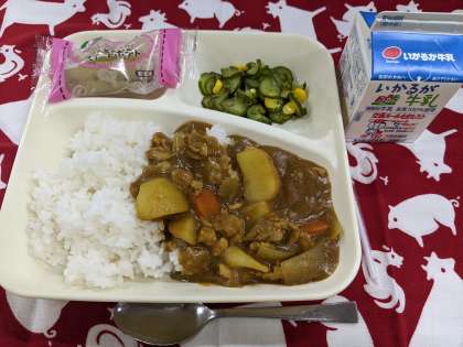 2月5日(月)のこんだては「チキンレバーカレーライス、きゅうりとコーンのサラダ、スイートポテト、牛乳」です。