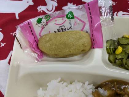 スイートポテトは、昨年度までは給食室で手作りしていましたが、今回から1人1つずつの袋入りのものが登場しました。卵、乳などの主なアレルギーの原因食材を使用していないので、アレルギーのある人も食べることができます。