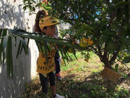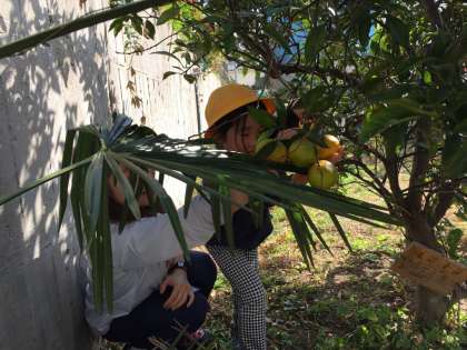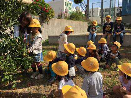 今日、1年生は自然観察学習園にみかん狩りに行きました。