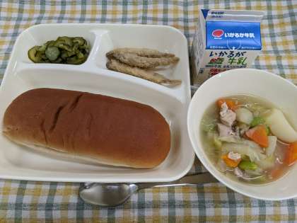 2月13日(火)のこんだては、「わかさぎフライ、洋風煮、きゅうりのピクルス、黒糖パン、牛乳」です。