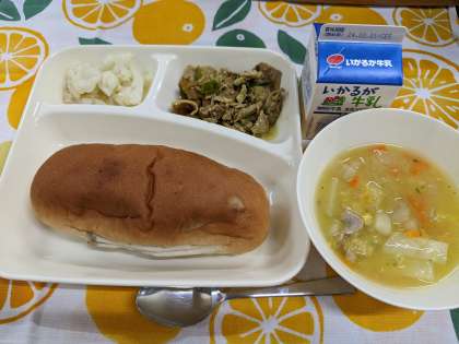 2月15日(木)のこんだては、「豚肉のカレー風味焼き、コーンとはくさいのスープ、カリフラワーのレモンドレッシング、レーズンパン、牛乳」です。
