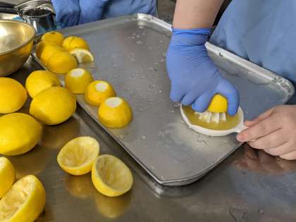 カリフラワーのレモンドレッシングは、国産レモンの果汁をしぼり、砂糖、塩、白こしょう、ワインビネガー、綿実油と合わせてドレッシングを作り、あえています。レモンのさわやかな香りが楽しめるこんだてです。レモンはインドが原産の果物で、日本には江戸時代に伝わりました。広島県、愛媛県、和歌山県などで多く栽培されています。
