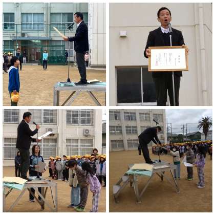 子どもたちの表彰の後、全国小学校ラジオ体操コンクールで文部科学大臣賞を取ったことに対して、令和5年度の教育長表彰もいただいたので、そのお披露目がありました。