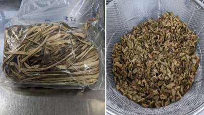 干しずいきは、さといもの葉柄の部分を乾燥させた保存食です。食物せんいやカルシウム、鉄を多く含み、シャキシャキとした食感が特徴です。水でもどして下ゆでした後、豚肉、うすあげと一緒にいため煮にし、砂糖、みりん、こいくちしょうゆ、赤みそで味つけしています。