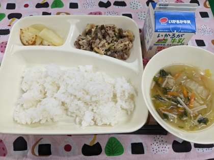 2月20日(火)のこんだては、「豚肉と干しずいきのみそ煮、すまし汁、あげ焼きじゃが、ごはん、牛乳」です。