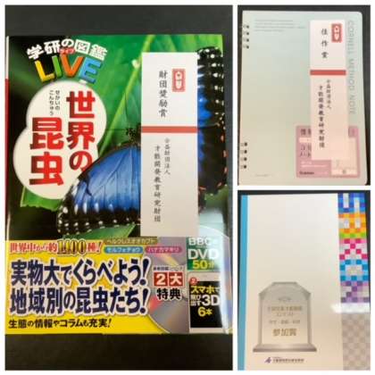 副賞として、世界の昆虫図鑑やノート、参加賞のノートは事前にお渡しをしています。