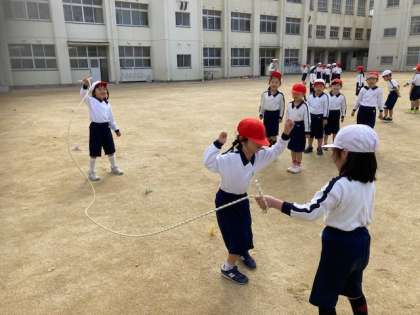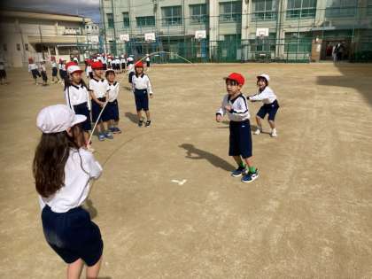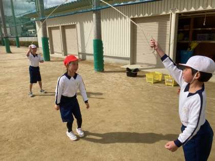 大縄跳びでは、回す事が難しいけど大切と気づき、大きく回していました!