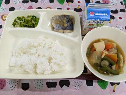 3月7日(木)のこんだては、「さごしのおろしじょうゆかけ、さといもと野菜の含め煮、なのはなのおひたし、ごはん、牛乳」です。