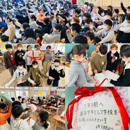 卒業お祝い集会では、司会や挨拶、花のアーチ持ち、呼びかけ等、自分の役割をしっかりと果たし、6年生に感謝の気持ちを伝えることができました。