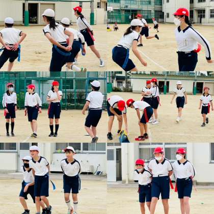フラッグフットボールの前に、準備運動として、タグ取りおにごっこをしました。