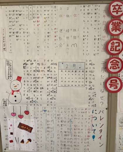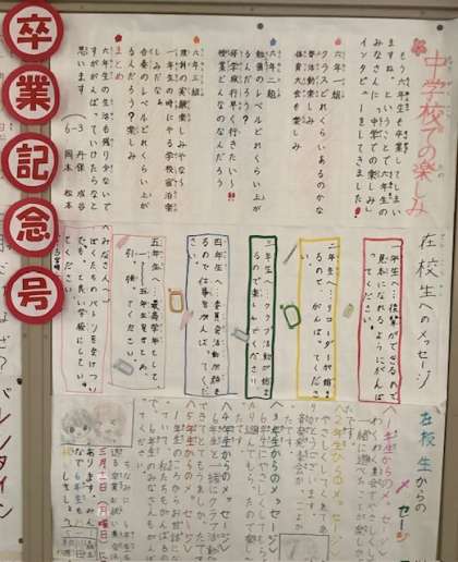 昨日、卒業式が行われ6年生が巣立っていきました。卒業生から各学年へのメッセージと在校生から卒業生へのメッセージが掲載されています。