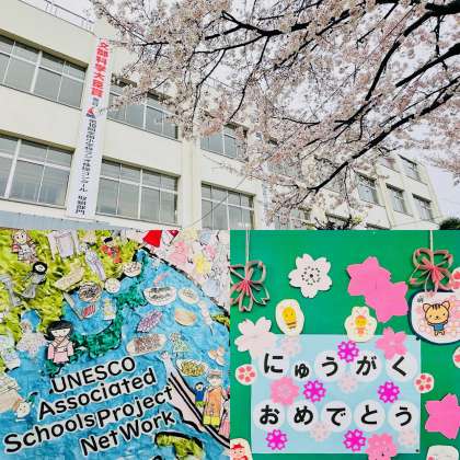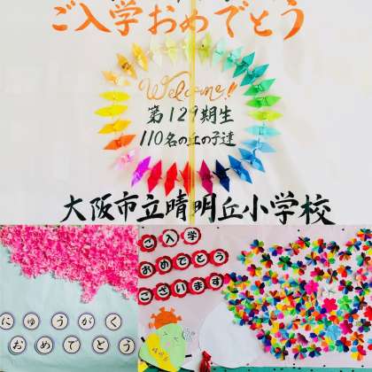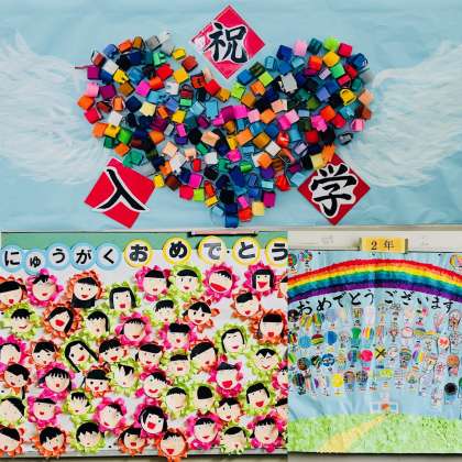 晴明丘小学校の校内は、新入生をお迎えするために在校生が用意した、お祝いの掲示物で彩られています。