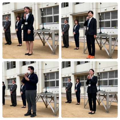 始業式の後には、着任式を行いました。今年度、着任された教職員方々の名前を校長先生から子どもたちへ伝えてもらった後、職員1人ずつ子どもたちへ自己紹介をしてもらいました。