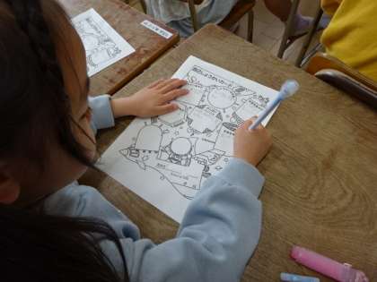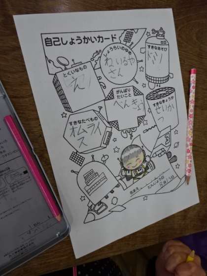 早くお友だちに自分のことを知ってもらうために、自己紹介カードを書いています。