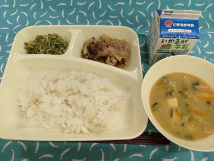 4月11日(水)の給食は「豚肉のしょうが焼き、とうふのみそ汁、じゃこピーマン、ごはん、牛乳」です。