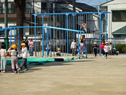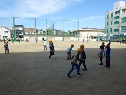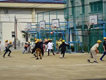 休み時間、子どもたちが運動場で元気に遊んでいます。
