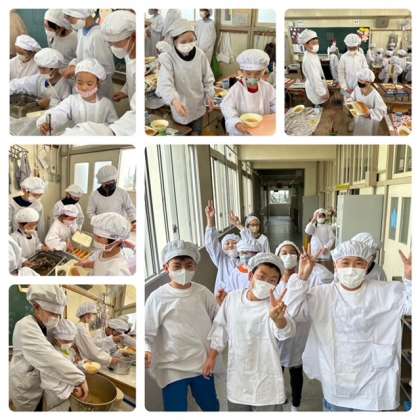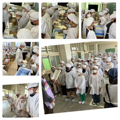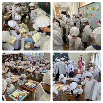 1年生の給食のサポートの様子です。いっしょに大おかずを入れたり、上手に配膳する方法を伝えたりしていました。目線を合わせて優しく声をかける姿がたくさん見られました。