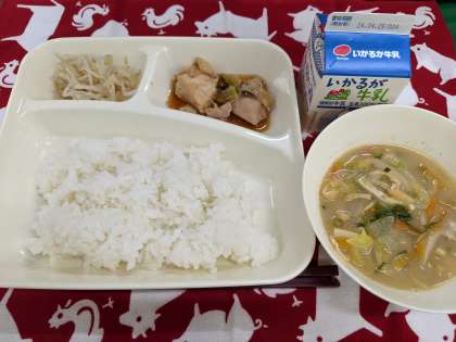 4月19日(金)の給食は「焼きとり、みそ汁、もやしのゆずの香あえ、ごはん、牛乳」です。