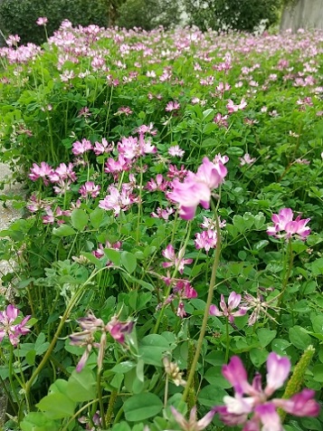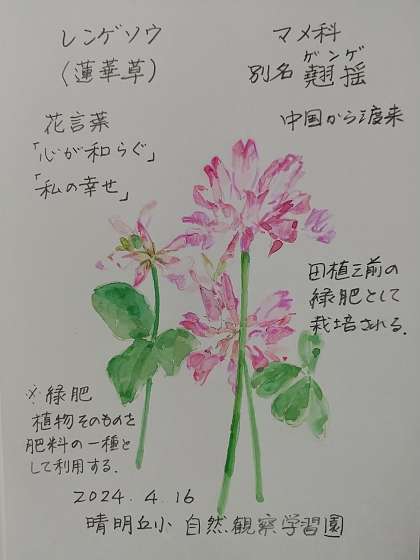 田の場所には、昨年レンゲソウの種がまかれ、今が花盛りです。レンゲソウは田の緑肥(植物を土地にすきこんで肥料にするもの)として利用されます。