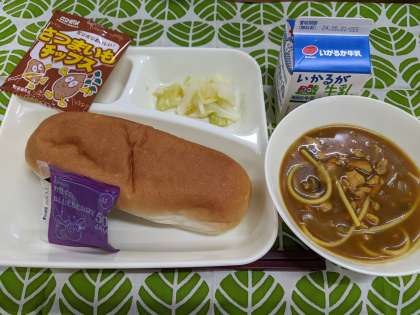 4月25日(木)の給食は「カレースープスパゲッティ、キャベツのピクルス、おさつチップス、コッペパン、ブルーベリージャム、牛乳」です。