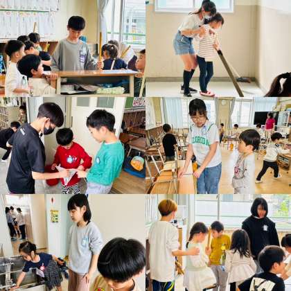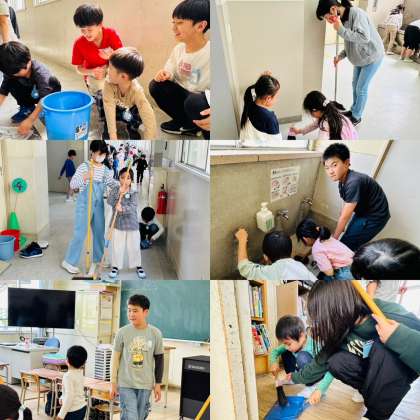 長いほうきを一生懸命に動かす1年生を、6年生は後ろから優しく手を添えてサポートしていました。
