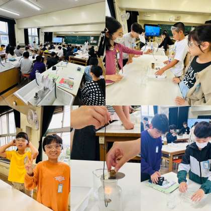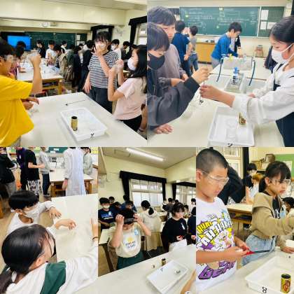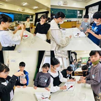 ろうそくを燃やす前後の、瓶中の空気に含まれる二酸化炭素について調べている様子です。